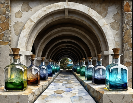 #GlassBottles #Corked #Tunnel #ArchedWalkway #ColorfulContents #StoneWalls #SymmetricalArrangement #Img2Img #AiArt #AiArtists #StableDiffusion #AiArtCommunity