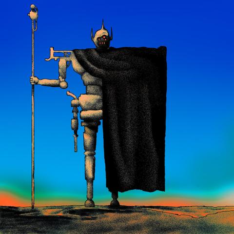 I think it's fantastic, it reminds me again of the Cyberiad, in that this creature looks like a sentient intelligence, maybe a cyborg and a desert dweller. Its posture is more careful openness than mindless violence. I think that this is an ally on our quest through the desert or whatever. He will show us where the fortress is, but won't go in 🤣