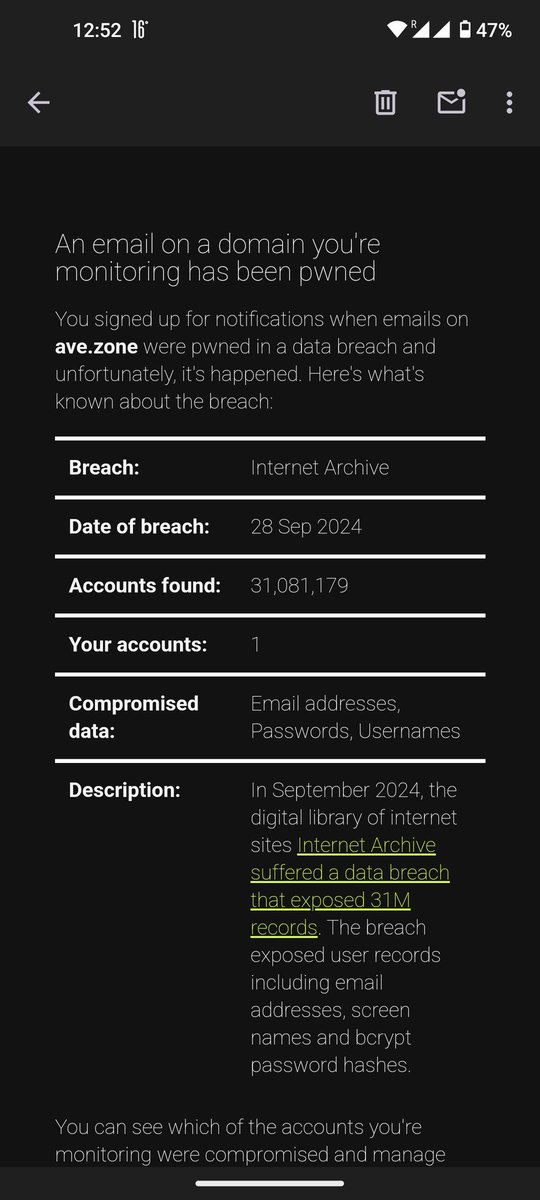 Troy posted his thread about one hour after this reply to Brewster Kahle: [WaybackSave/Archive] Tom Warren on X: “@brewster_kahle @internetarchive was it a little more than a DDoS?” (which attached the topmost picture in this blog post: thanks Tom!) and confirmation [WaybackSave/Archive] ave on X: “@tomwarren @brewster_kahle @internetarchive ah snap” (image on the right with HIBP email warning).