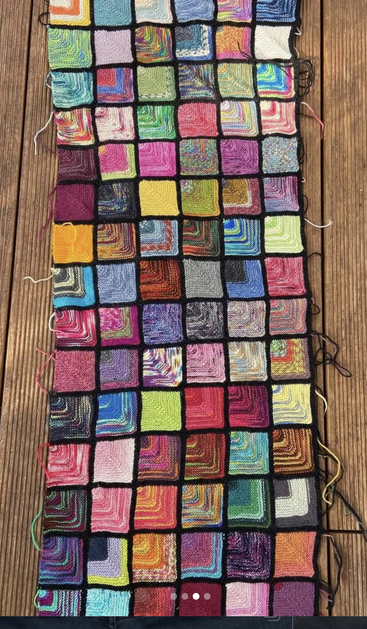Schmale #Decke, aus lauter bunter Wollresten; jedes eingerahmt mit schwarzem Rand. Die Quadrate sind 20 Maschen breit und 20 Maschen hoch und werden immer direkt an die vorhandenen angestrickt. Decke 2016 begonnen - Ende offen. #wip #stricken