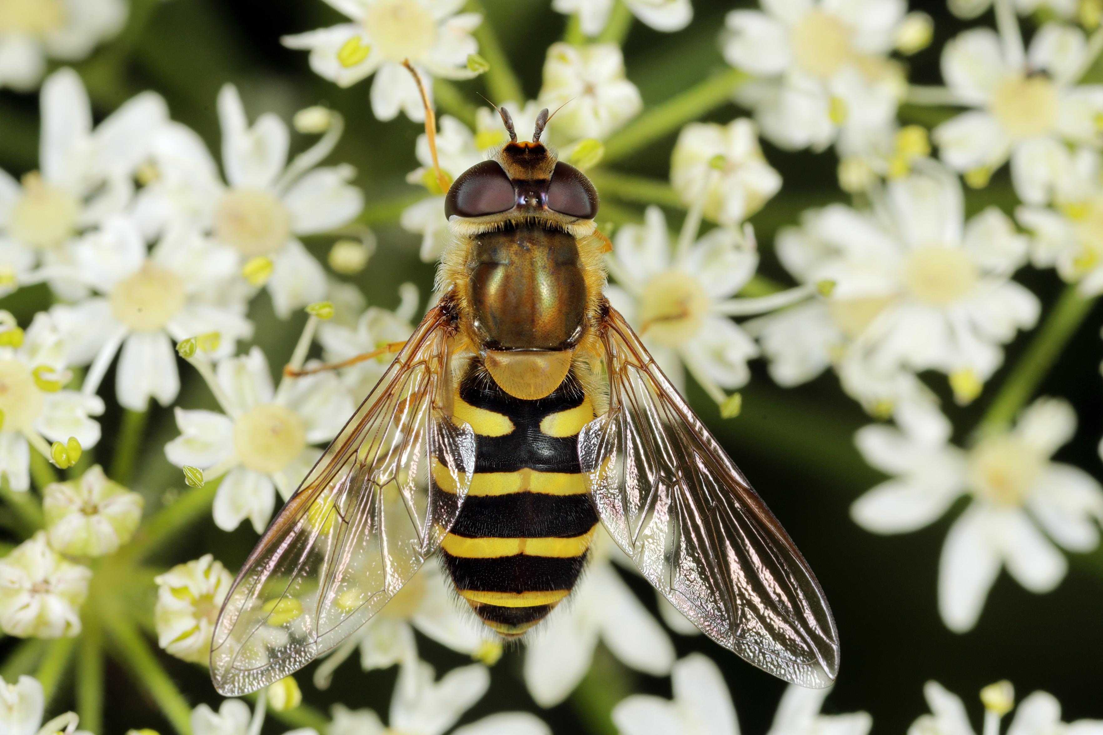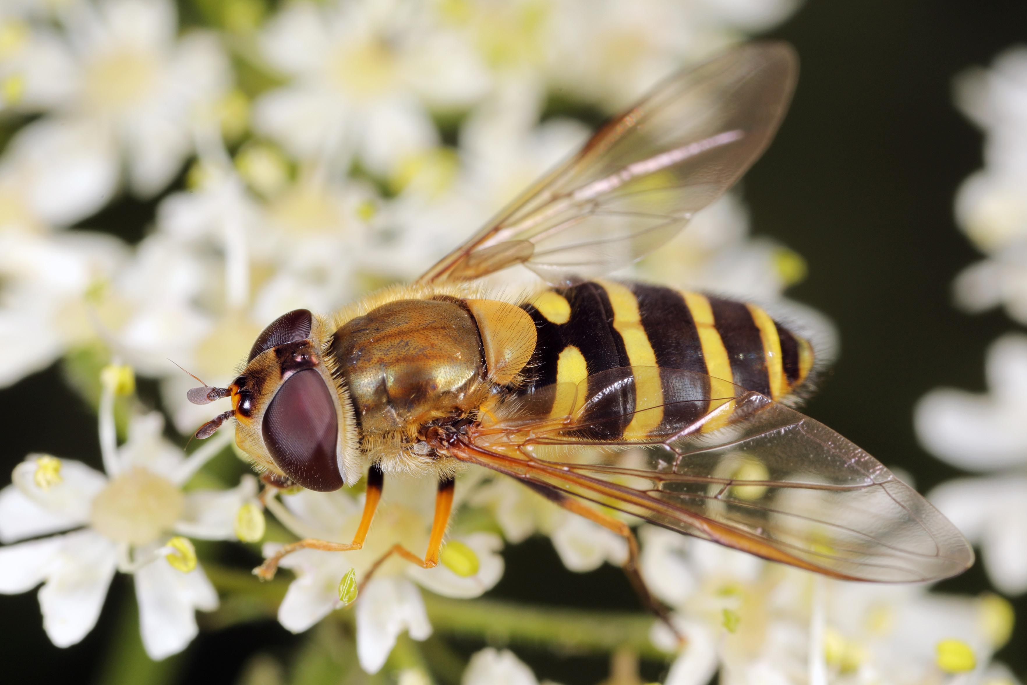 Behaarte Schwebfliegen (Syrphus torvus) ähneln der Gemeinen Garten-Schwebfliege (Syrphus ribesii). Wenn man nah genug rangeht und scharfe Fotos machen kann, erkennt man die behaarten Augen von S. torvus.
