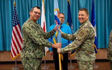 (Senior Airman James Johnson/Defense Logistics Agency Energy) U.S. Navy Capt. Patrick Brown, Defense Logistics Agency Indo-Pacific commander, left, passes the guidon to U.S. Air For…