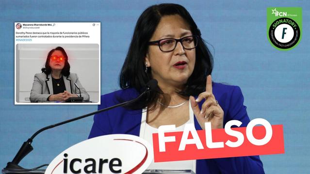 Se afirmó en X que la contralora general, Dorothy Pérez, destacó que la mayoría de los funcionarios sumariados, durante su gestión, fueron contratados en la presidencia de Sebastián Piñera. Sin embargo, Fast Check calificó esto como #Falso. El análisis no cubrió ese periodo y Pérez tampoco mencionó a algún presidente en su discurso en ENADE.