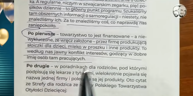 "towarzystwo to jest finansowane - a niewykluczone, że wręcz założone - przez firmę produkującą słoiczki dla dzieci, mleko w proszku i inne produkty. To według nas jest jawny konflikt interesów".