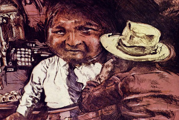 The image depicts an artistic portrait of a person in profile view, characterized by expressive brushwork. The individual appears to be holding or embracing another figure depicted partially within the frame, which is also stylized through exaggerated features typical of caricature art.