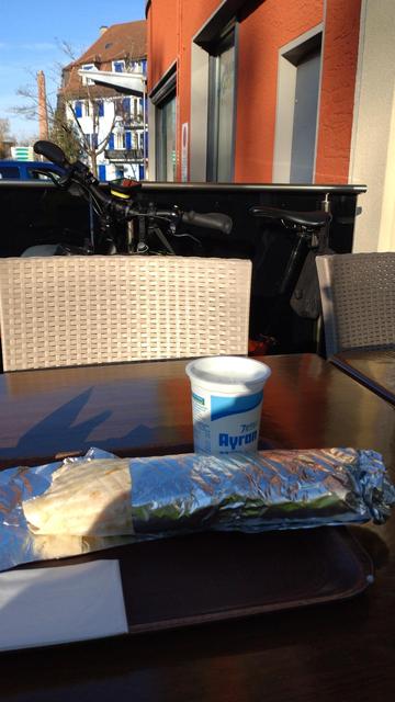 Heute bzw. jetzt schon gestern über den Mittag zum #Impfen gewesen und auf dem Rückweg trotz #Frostpendeln Saison draussen in der Sonne 'n Falafel-Dürüm genossen. Wie üblich mit dem #Faltrad am Tisch und kein Schloss rauskramen müssen.