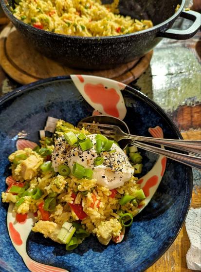 Abendessen: Irgendwas mit gebratenem Eierreis mit Hühnchen, Curry, Knoblauch, Gemüse. Auf dem Teller mit Joghurt, Frühlingszwiebeln und Bagelgewürz.