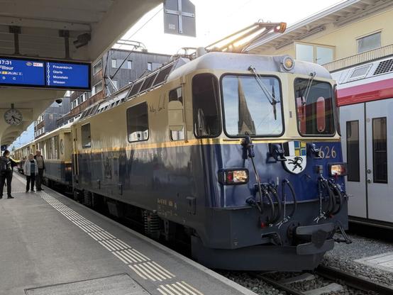 Wir nutzten das schöne Wetter, um den Davosersee zu Fuss halb zu umrunden und kurz einzukehren, bevor wir mit dem Bus zum Bahnhof Davos Platz fuhren. Dort stand ein spezieller Zug bereit. Er war nicht für uns gedacht, sondern gerade von einer Ausfahrt zurückgekommen: der „Alpine Classic Pullman Express“, ein historischer Zug der RhB mit bequemen Sitzen, vielen Schnörkeln und klassischem Flair.
