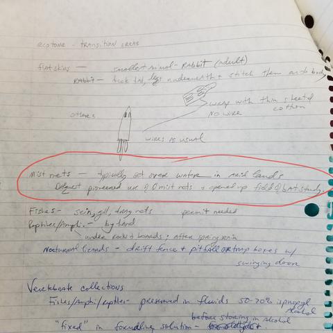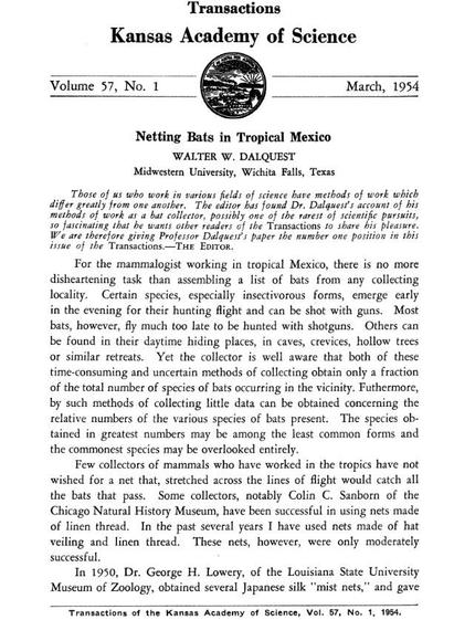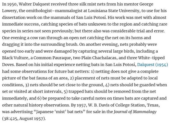 While cleaning out my office I ran across my class notes from Field Zoology that I took as an undergraduate in 1989. This class set the stage for my career as a field biologist. I was hooked. In these notes, I have written that Dr. Walter Dalquest invented the use of mist nets for capturing bats. Three years later, Dr. Dalquest (Doc) would become my Master's thesis advisor. I had forgotten all about this little historical fact. So I did some research and confirmed it!