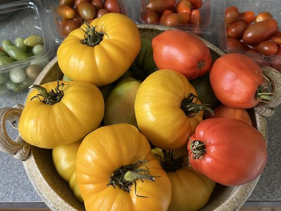 Lotsa tomatoes from the community garden this year. And I havenβt bought a single plant! The heirloom and Roma tomato seedlings were given by a fellow gardener who ran out of space in her plot and the grape tomatoes grew from the seeds of the supermarket ones. Theyβre all delicious! π β¨