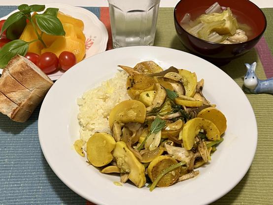 Summer squash* with shiitake and oyster mushrooms served with saffron rice. Orange heirloom tomato* and grape tomatoes* with basil. Miso soup features Napa, gold potato, bittermelon* and abura-Γ’gΓ©.
