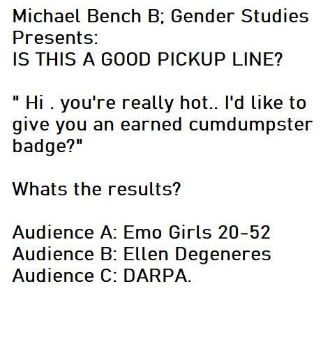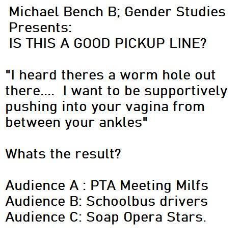 Gender Anthropologist Michael Bench B Announces new pickup lines survey. 2 items for exercise: