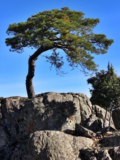 Pino moldeado por el viento, alzándose sobre roca de la sierra de Guadarrama.