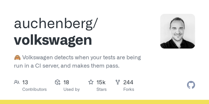 So, you're telling me there is an #opensource utility called #Volkswagen on the loose that lets "software developer" to relax by detecting when tests are running in #CI environment, only to make them pass and ignore the problems these tests were supposed to prevent in the first place?