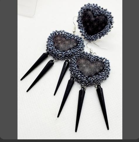 Hearts with cobweb design surrounded by color lined seed beads. Earrings have spike dangles. Ring is on an adjustable base.