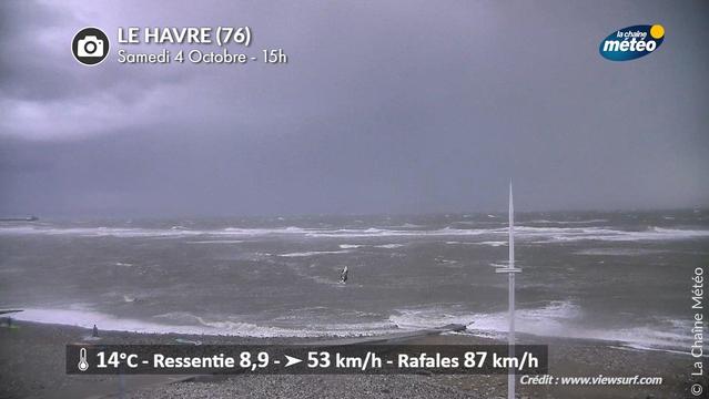 🚩Une rafale vient d'atteindre 131 km/h au cap de la Hève au-dessus du #Havre (76). La mer est démontée avec des 🌊vagues de 4 à 5 mètres au large. Cela n'empêche pas un véliplanchiste bien imprudent d'affronter ces intempéries.
