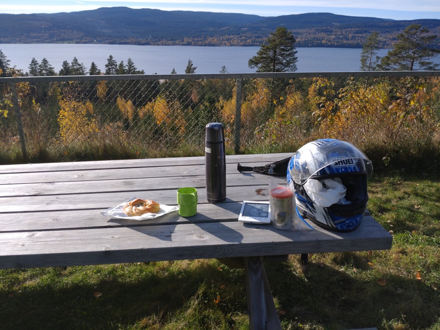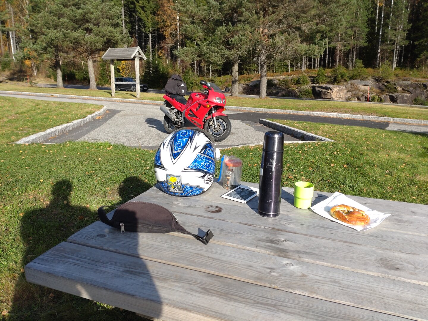 Pistasjknute fra brødbakerne på Gjelleråsen med pulverespesso på Østerhøgda rasteplass på østsida av Hurdalssjøen 12. oktober 2025 #høst2025 #oktober2025 #october2025 #autumn2025 #høst #autumn #motorcycle #motorsykkel #vfr #viffer #vfr750f #honda #honda_vfr #motorcycle #høst #høstfarger #autumn #østerhøgda #hurdalssjøen #hurdal #viken #norge #norway