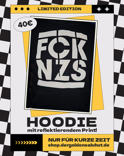 👉 https://shop.dergoldenealuhut.de/produkt/fcknzs-hoodie-schwarz-lichtreflektierende-farbe-limited-edition-bio-vegan-fairtrade