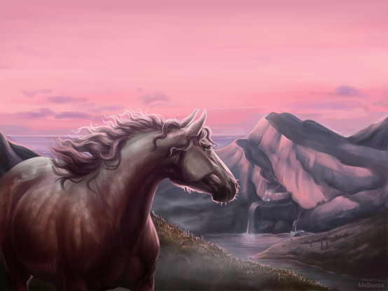 A contemplating mare looks at distant mountains and waterfalls falling from them. She meets the pink dawn with hope.