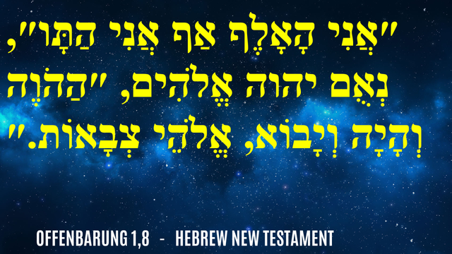 Ich bin das Alpha und das Omega, sagt JHWH (Herr) , der Gott, Der Ist (Seiende) und Der War (Gewesene) und Der Kommen Wird (Kommende), der Allmächtige (Zebaot).
