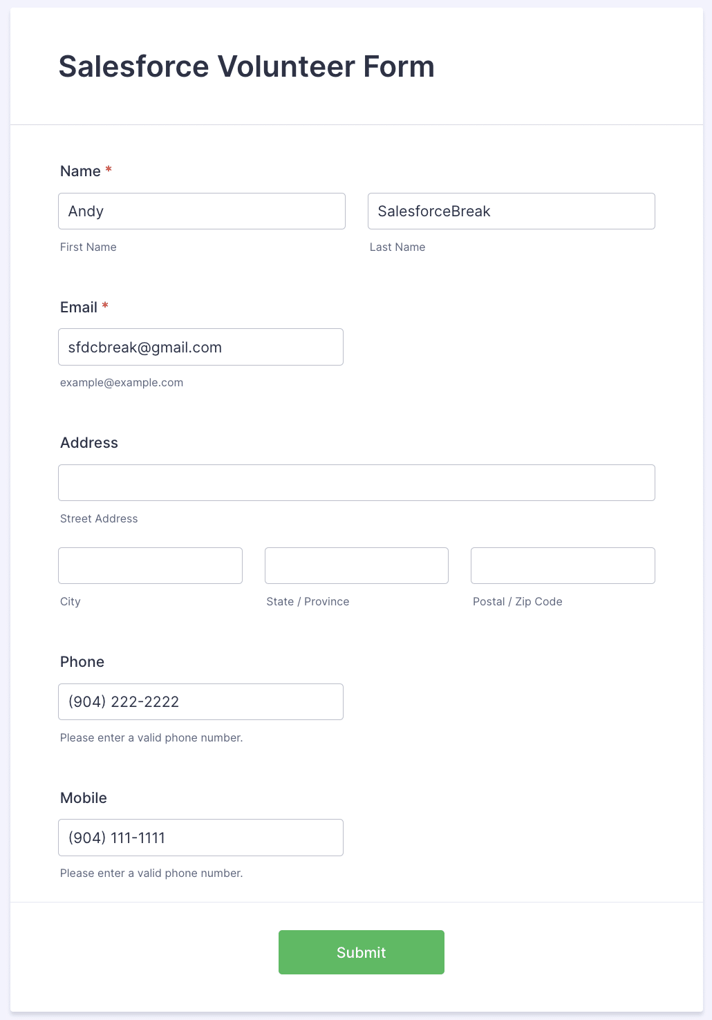 Here is a sign up page for a Nonprofit volunteer event. The current contact information will be pulled and displayed if the volunteer is found in the system. The user can then update the information in Salesforce if necessary. A new record is created if the information is not found in the system.