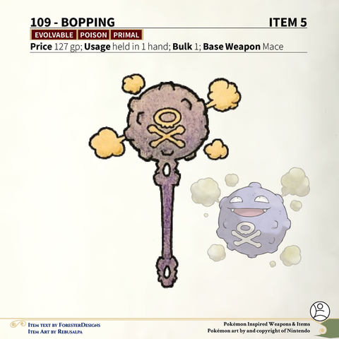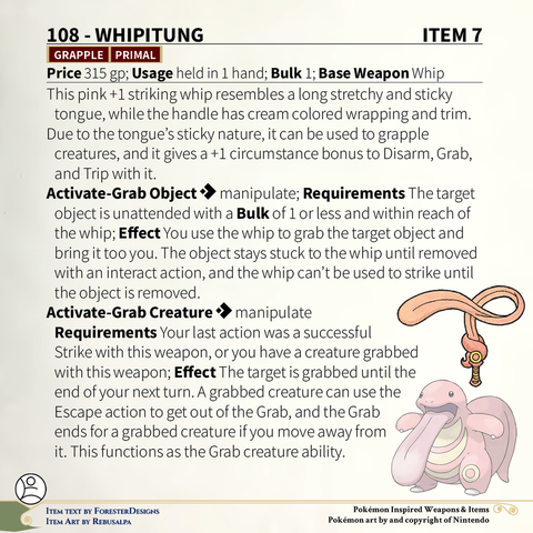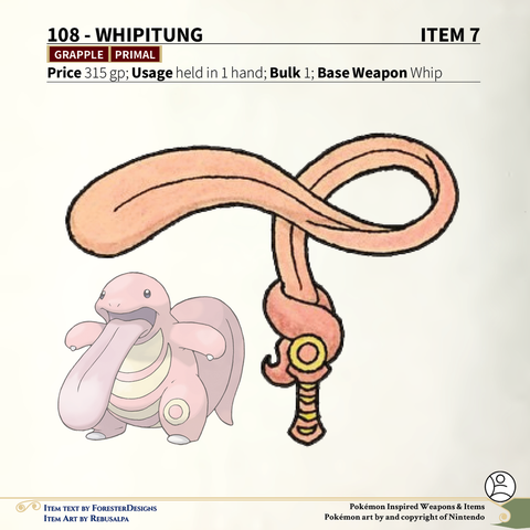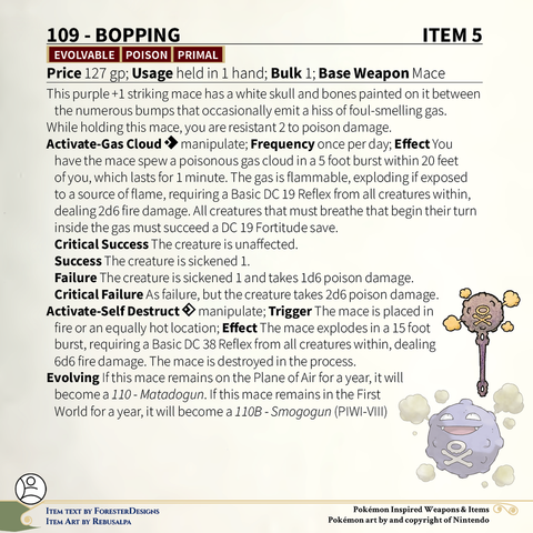 A #Pathfinder2e conversion of my older #Pokemon #MagicItems, with a sticky #Lickitung #whip and smoky #Koffing #mace!