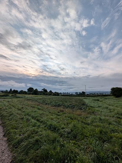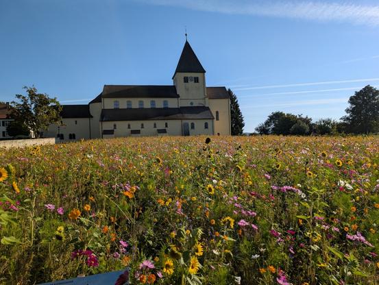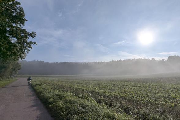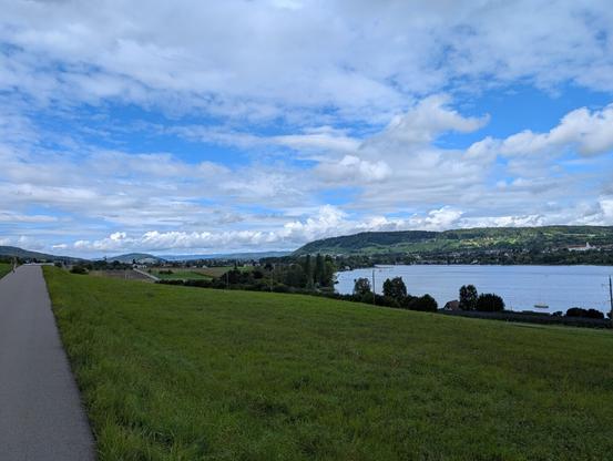 I sat down on bench and ate some Streuselkuchen and filled up my water bottles at a fountaine. Then I started my way back via Thayngen, which took me mostly through the busy city of Schaffhausen and then following along a road with heavy traffic. Luckily the cycling path veered off the road and followed the Biber creek with fields planted with corn on the left and the creek to the right. I passed through the german enclave Buch, which is completely enveloped by Switzerland and from there mostly took back road through fields and meadows with the occasional gravel road towards Radolfzell. There is this lovely bicycle road between the rail roads and the lake shore shaded by trees, which put me on the home stretch.