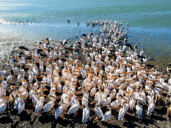 A flock of pelicans congregate on the shore of Lake Manyas (Manyas Gölü in Turkish), where decreasing water levels caused by severe drought are threatening the habitats of migratory birds, #Turkey