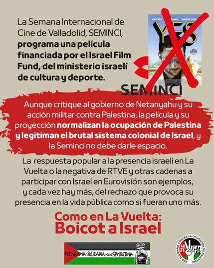 La #SEMINCI (Semana Internacional de Cine de #Valladolid) ha programado en su Sección Oficial la película #Israelí “Yes”, del director Nadav Lapid, que aunque es crítica con el gobierno y con el #genocidio, está financiada por el #Israel Film Fund, del Ministerio israelí de Cultura y Deporte. Como ocurre con tantas críticas internas al gobierno de #Netanyahu y al genocidio, la película y su proyección normalizan la ocupación de #Palestina y legitiman el sistema #colonial de Israel, como reconocen incluso algun@s profesionales del cine israelíes como Avigail Sperber.