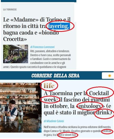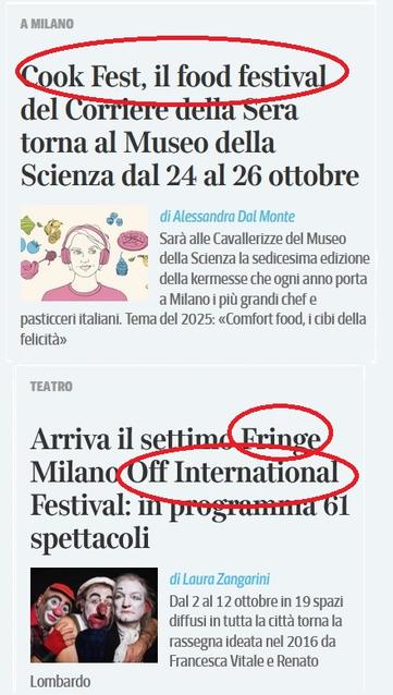 La scelta di denominare in inglese i nomi delle manifestazioni non è un’insolita bizzarria – come si potrebbe evincere dalle parole della Crusca – è invece una ben precisa strategia che vale per ogni tipo di manifestazione, evento o mostra. In ottobre, a Milano, ci sarà la Cook-Fest, il food festival del Corriere della Sera, e il settimo Fringe Milano Off International ideato da due nativi italiani con la testa nell’anglosfera. Tempo fa avevo denunciato come persino una mostra dedicata alla figura simbolo dell’italiano era stata anglicizzata attraverso il Dante Vibes, e prima ancora avevo fatto delle ricerche sulle denominazioni in inglese che erano prevalenti rispetto a quelle in italiano persino nelle manifestazioni paesane (notevole il Tractor Day).