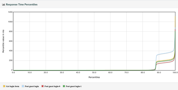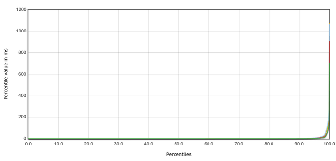 I guess this funny looking graph showing response time percentiles is exactly the result of one of 8 service worker threads having a lot more to do than all others. I wonder whether this could be a behavioral artifact of the #lockfree #queue used to distribute the accepted connections. 🤔