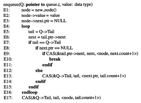 There is *still* a very rare data #race in the #lockfree #queue. I *think* I can spot it in the pseudo code from the paper I used[1], see screenshot. Have a look at lines E7 and E8. Suppose the thread executing this is suspended after E7 for a "very long time". Now, some dequeue operation from some other thread will eventually dequeue whatever "Q->Tail" was pointing to, and then free it after consumption. Our poor thread resumes, checks the pointer already read in E6 for NULL successfully, and then tries a CAS on tail->next in E9, which is unfortunately inside an object that doesn't exist any more .... If the CAS succeeds because at this memory location happens to be "zero" bytes, we corrupted some random other object that might now reside there. 🤯