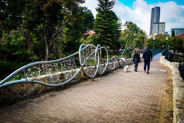 The Riverbank Love Knot is a stainless steel public art installation in Adelaide, Australia, located in Park 12 near the University Footbridge, designed by Mulloway Studio and unveiled on Valentine's Day 2018 to provide a dedicated spot for couples to attach "love locks" and symbolize enduring love, offering an alternative to placing them on the nearby footbridge. The intertwined knot design represents unbreakable binding and eternal fidelity.