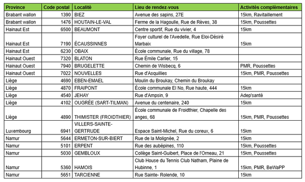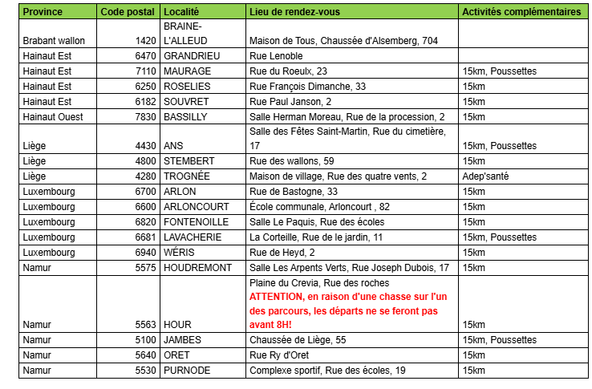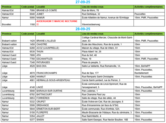 En Belgique, l’ADEPS (Administration de l’Éducation physique, du Sport et de la Vie en Plein Air) organise de nombreuses marches au cours de l’année. Chaque dimanche et jour férié, des promenades balisées sont proposées en une vingtaine de sites disséminés sur tout le territoire de la Wallonie et de Bruxelles. Des parcours de 5, 10, 20 (et parfois 15 km), pour tous les types de randonneurs. Une bonne occasion de marcher pour les belges et les frontaliers.
