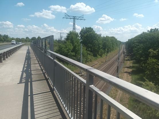 Hinter dem gesperrten Teilabschnitt folgen wir dem normalen Weg wieder - hier ist es überhaupt scary. An mehreren Lostplaces der ehemaligen Bahnanlage hängen Flatterbänder und Schnüre an denen gruselige Puppenköpfe hängen. Uns ist hier überhaupt nicht nach Lostplace Erkundung, sondern nur nach schnell weg. Es geht noch eine ganze Weile an den Bahngleisen entlang, erst bei Kilometer 5 biegen wir links ab, queren über einer Brücke die Autobahn A10 (Berliner Ring) und stoßen dann endlich in weitaus ruhigeres Gebiet, fernab ab von Autobahnen und vorbeirasenden Regionalbahnen und Schnellzügen.