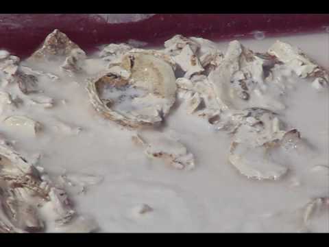 "This is footage from the Chincoteage lighthouse Sept 25 2009. The Historic Preservation Training Center instructors demonstrating How to create lime by adding oyster shells to water to produce mortar used in historic preservation of buildings in general. What you are seeing is the reaction of the shells in water after about 15 minutes. This mortar was used to repair the inside masonry walls of the 'OIL SHED' located beside the lighthouse. The Shells are fired to remove the carbon dioxide prior to adding them to the water in the wheel barrow. They turn to a creamy paste, known as lime or lime putty. Add sand or aggregate and apply to application."