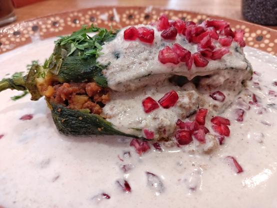 y ahora, un clásico insignia que no puede faltar, el #ChileEnNogada... que sí va capeado o que si va sin capear... como sea, a mi me gusta el chile al natural (sin albur) 😋 muchos quizá ni los puedan probar como para ponerse de reina...