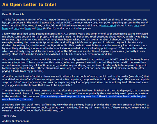 "Thanks for putting a version of MINIX inside the ME-11 management engine chip used on almost all recent desktop and laptop computers in the world."