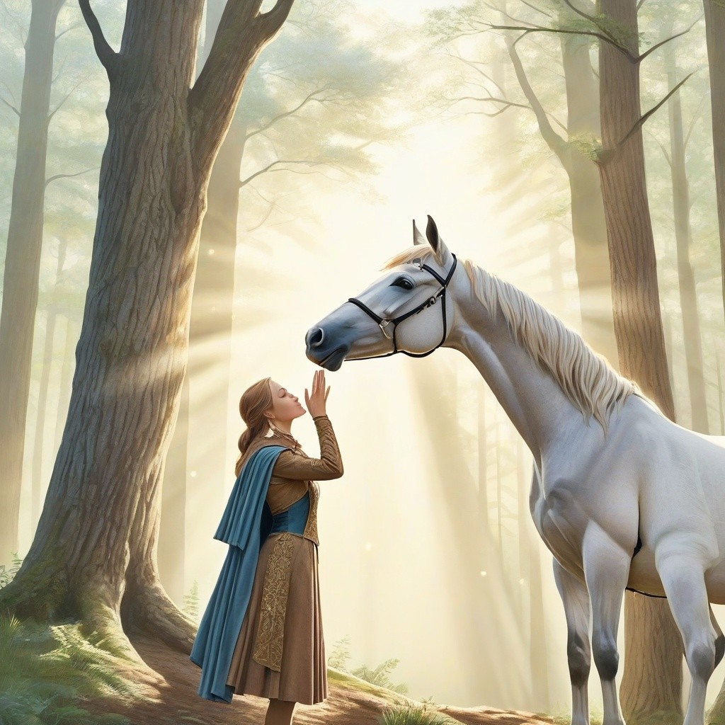 Prompt used: A unique perspective of a rider gently touching the forehead of a horse, their eyes meeting in a moment of quiet understanding. The background is a misty forest clearing at dawn, with rays of light filtering through the trees, casting a soft, ethereal glow over the scene, symbolizing trust and harmony