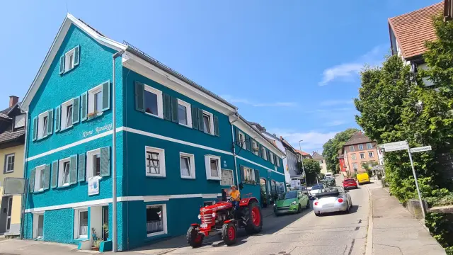 Unsere Krone Randegg von 1774 halten viele für einen Farbtupfen im Dorf, selbst wenn nicht grad bunte Fahrzeuge unterwegs sind.