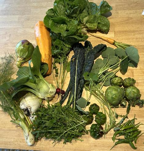 The allotment looks quite sad, the harvest doesnโt: white cabbage, green hot peppers, arugula, the last zucchini, a carrot, artichokes, nasturtium, radish, peppers, bok choy, fennel, kale and endive