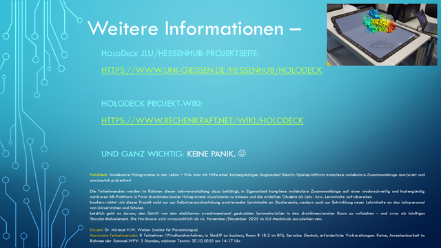1/n Am 23.10. hatte ich für Angehörige der #JLU Gießen erstmals meinen dreistündigen Kurs "#HoloDeck: Molekulare #Hologramme in der #Lehre" präsentiert - basierend auf der #AugmentedReality #Gaming Hardware der kalifornischen Firma #TiltFive und einer von unserem Rechenkraft.net Team in #Unity entwickelten Software.