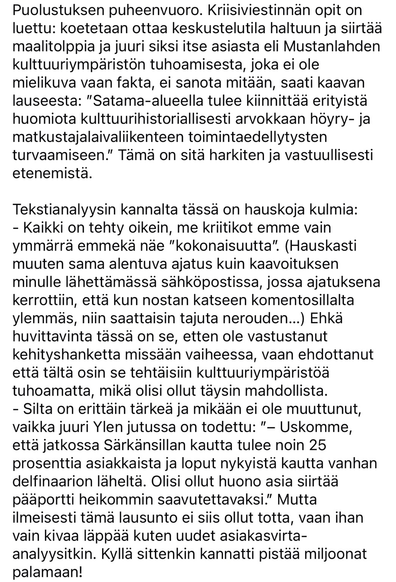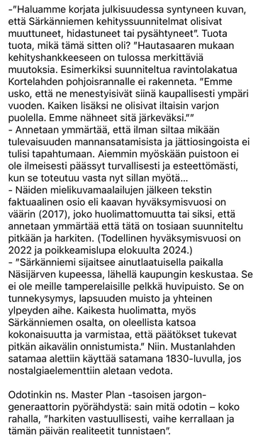 Särkänniemen puolustuspuhe ja vastaukseni kuvina. Kriisiviestintää, jolla pyritään ottamaan keskustelu haltuun; kerrotaan, että minä olen vain ymmärtänyt väärin ja että Särkänniemessä kaikilla on kivaa. Sataman tuhosta ei tietty sanota mitään. Jargon-generaattori lähti päälle.