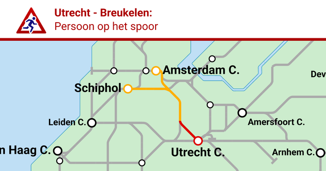 Er is een storing op het traject Utrecht - Breukelen door een persoon op het spoor. Deze storing begon op 19 oktober 2025 om 19:31.