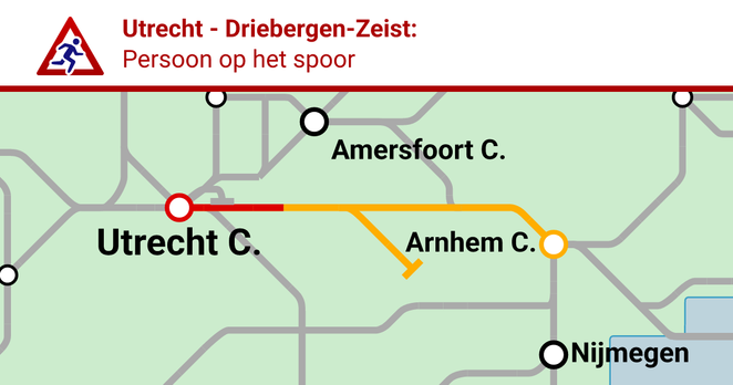 Er is een storing op het traject Utrecht - Driebergen-Zeist door een persoon op het spoor. Deze storing begon op 19 oktober 2025 om 19:47.