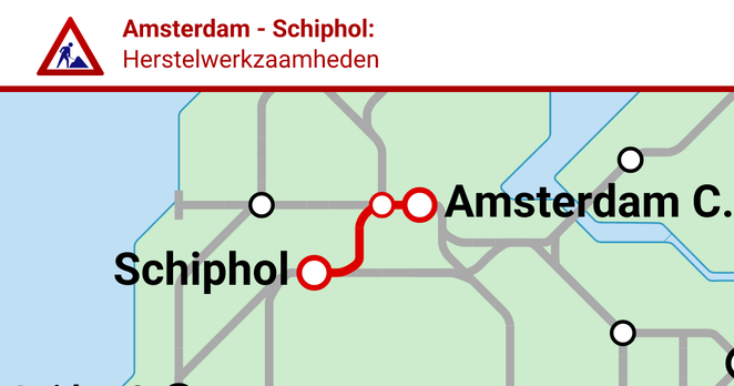 Er is een storing op het traject Amsterdam - Schiphol door herstelwerkzaamheden. Deze storing begon op 20 oktober 2025 om 01:35.