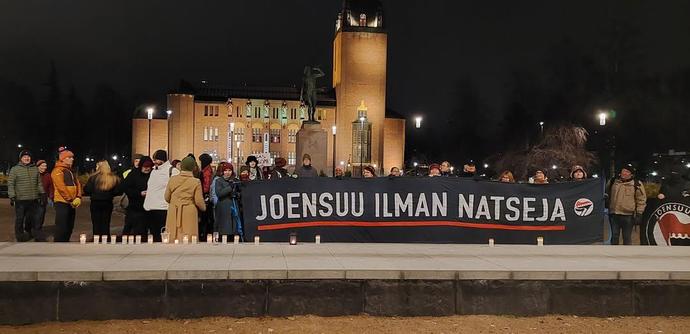 Joensuun kirjastolla keskusteltiin rasismin vaarasta ja kulkueessa muistettiin jälleen rasismin ja fasismin uhreja. Mukana oli uusi hieno banderolli, jonka taakse keräännyttiin kulkueen lopuksi.