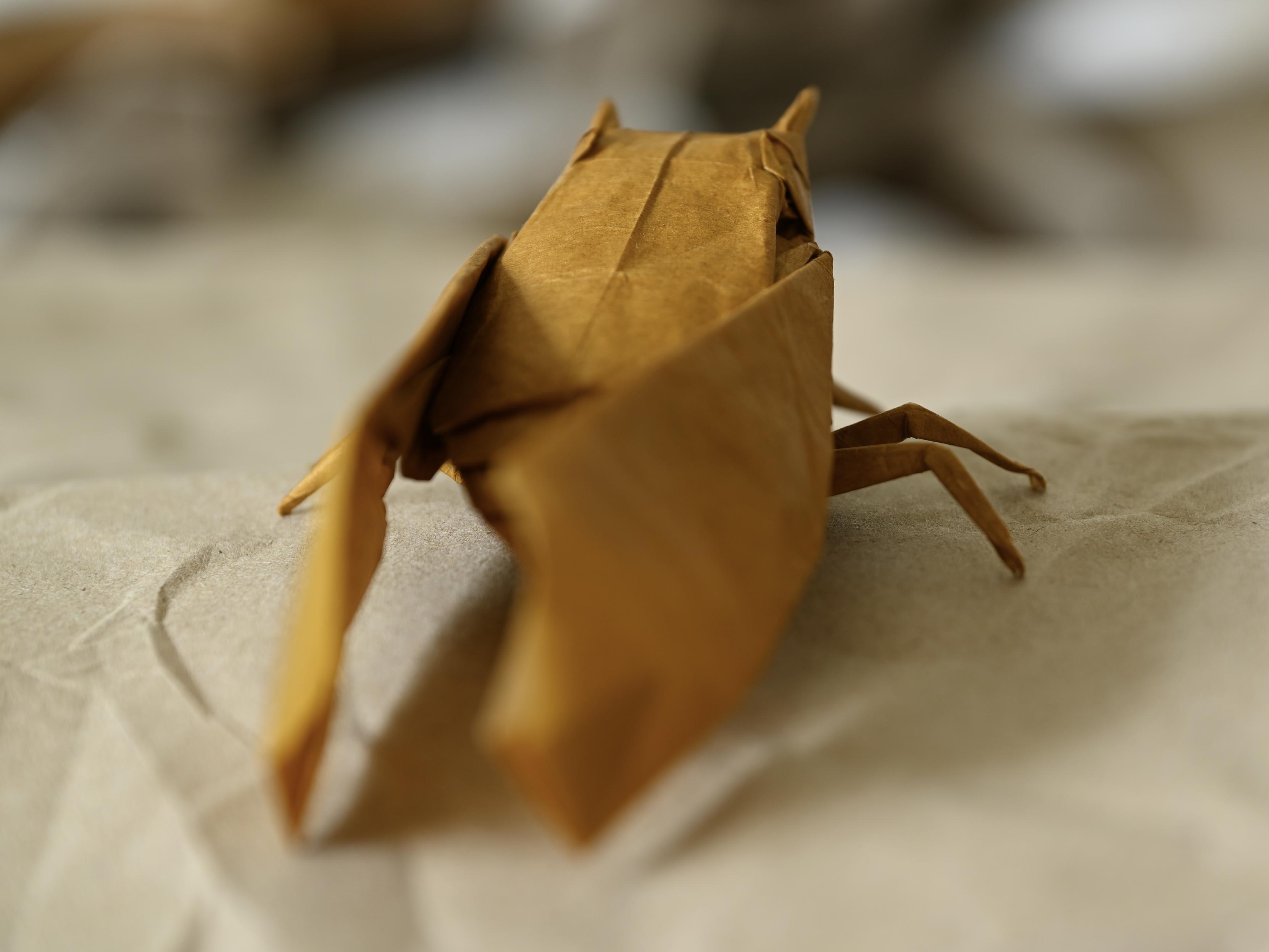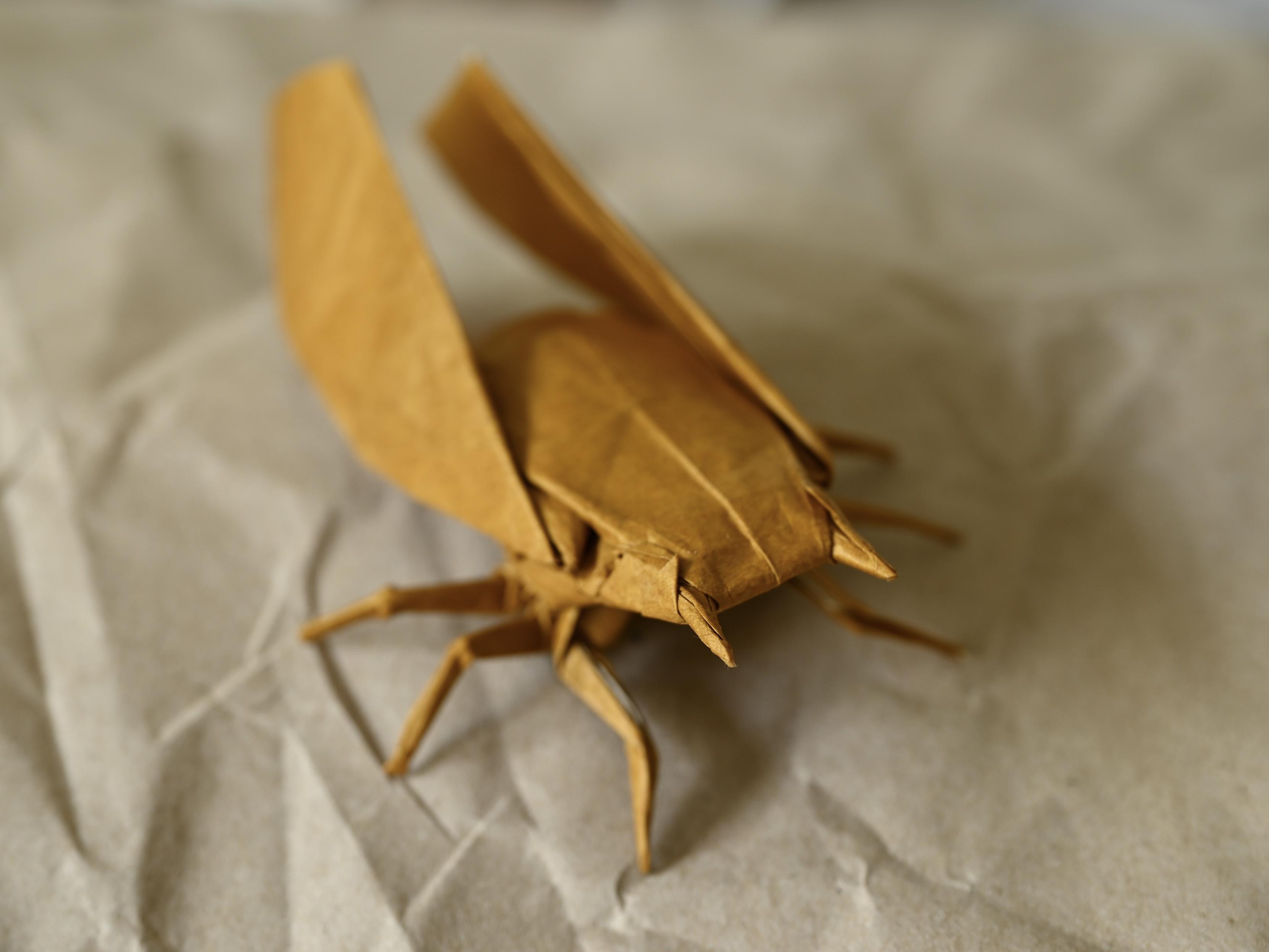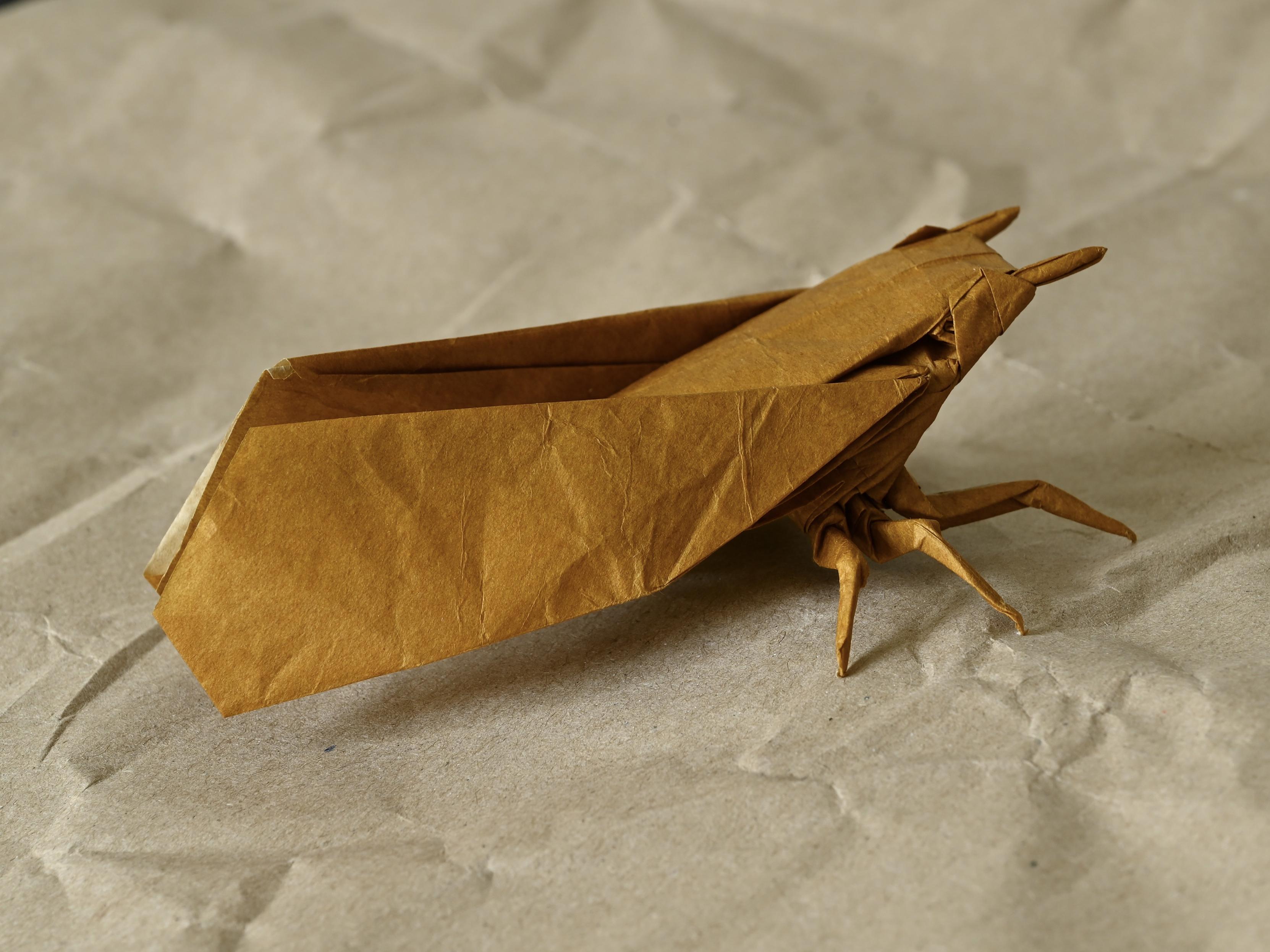 Robert Lang’s Classical Cicada opus 676, folded from a 30 cm square of double tissue.