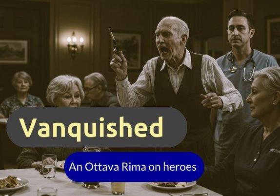 Ottava rima, an eight line verse of iambic pentameter in traditional form, has been used alternatively for heroic poems (“Don Juan”) or to mock or parody heroism. I tried to split the difference here, in form and content.