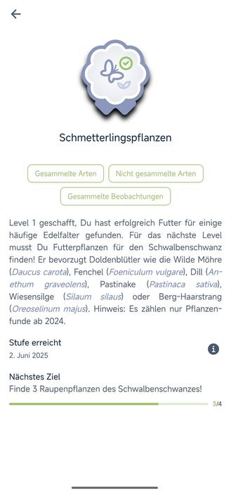 Hallo @FloraIncognita_DE ,es gibt da was, was ich nicht verstehe. In der Kategorie Schmetterlingspflanzen ist mein nächstes Ziel, 3 Raupenpflanzen des Schwalbenschwanzes zu finden. Als Fortschritt wird mir 3 von 4 angezeigt. Und in den gesammelten Beobachtungen sind es bereits 10 Arten. Was passiert hier? 🤔